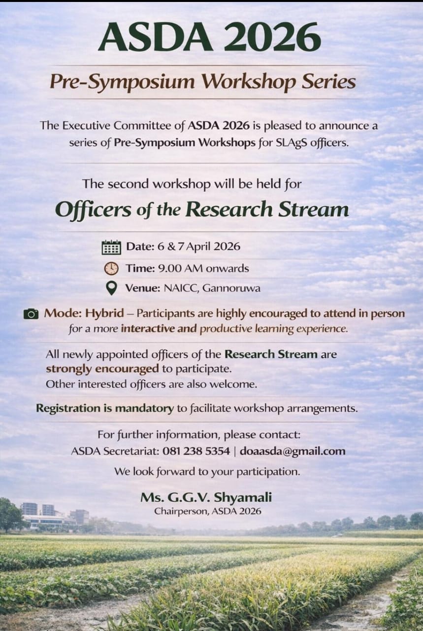 As we gather in early September 2026, ASDA will once again become a vibrant arena of ideas, where evidence informs policy, innovation drives resilience, and collaboration fuels progress. Together, let us reimagine a future where Sri Lankan agriculture is sustainable, competitive, climate-resilient, and inclusive.